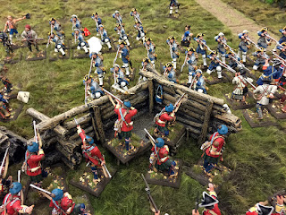 The British defenses staved off two waves of assaults, losing the Colonial skirmishers and rushing the Grenadiers to the vacated left side of the breastworks.